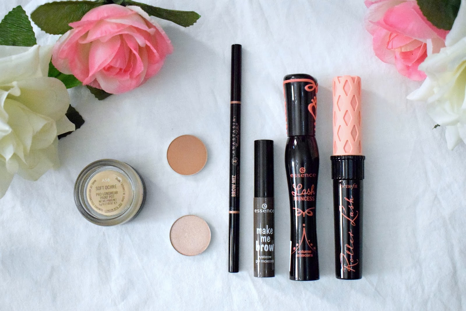 Eu gosto de manter as minhas sobrancelhas o mais natural possível. Para isso eu uso sempre o meu lápis da Anastasia Beverly Hills, o Brow Wiz, levemente para preencher alguns espaços que não têm muito cabelo, e para fixar o lápis eu utilizo o meu gel da Essence, o Make Me Brow Eyebrow Gel Mascara, que é um produto baratinho fantástico e que faz com que as minhas sobrancelhas se mantenham no lugar o dia todo. Agora está na altura de aplicar primer nos olhos, e nada segura melhor as minhas sombras do que o Paint Pot na cor Soft Ochre da MAC. Depois de 12 horas de uso as minhas sombras ainda estão intactas, eu sei é difícil de acreditar mas é verdade! Embora às vezes só utilize máscara de pestanas, a maioria das vezes eu opto por uma maquilhagem muito simples com uma sombra castanha no côncavo, uma sombra brilhante na pálpebra, no osso da sobrancelha e no cantinho interno do olho. Normalmente eu utilizo uma paleta diferente a cada vez que quero utilizar sombras, por isso eu não utilizo as mesmas sombras todas as vezes. Tenho adorado a sombra unitária da Makeup Geek na cor Crème Brulee para o côncavo e a sombra unitária da Makeup Geek na cor Shimma Shimma para toda a pálpebra, osso da sobrancelha e cantinho interno do olho. Para completar os olhos, eu aplico máscara de pestanas. Eu gosto de ter as minhas pestanas compridas, volumosas e separadas, e para conseguir esse efeito utilizo sempre as máscaras de pestanas Essence Lash Princess Volume Mascara e a Benefit Roller Lash Mascara que nunca me falham! Eu uso estas duas em combinação na ordem que acabei de as mencionar, e as minhas pestanas parecem "masé" pestanas falsas!